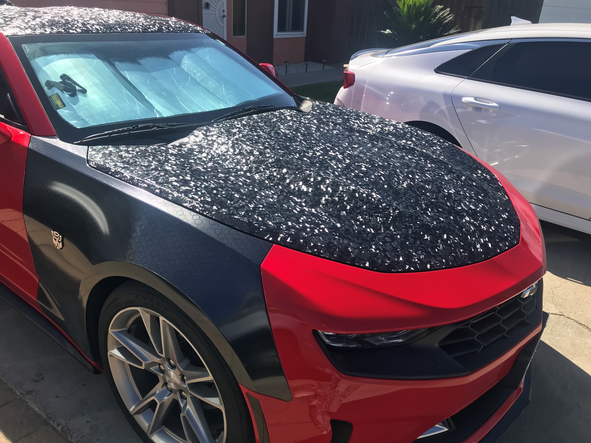 Our hood measures roughly 4' 8"x5' (Width to Length) so a single piece of 5x6ft should do it. We have found that the wrap we want is sold in various lengths but has a max width of five feet. We believe the chaotic nature of the design will help hide any inperfections of the hood repair. The wrap can be found at: https://vvividshop.com/products/2020-vvivid-black-forged-carbon-fiber